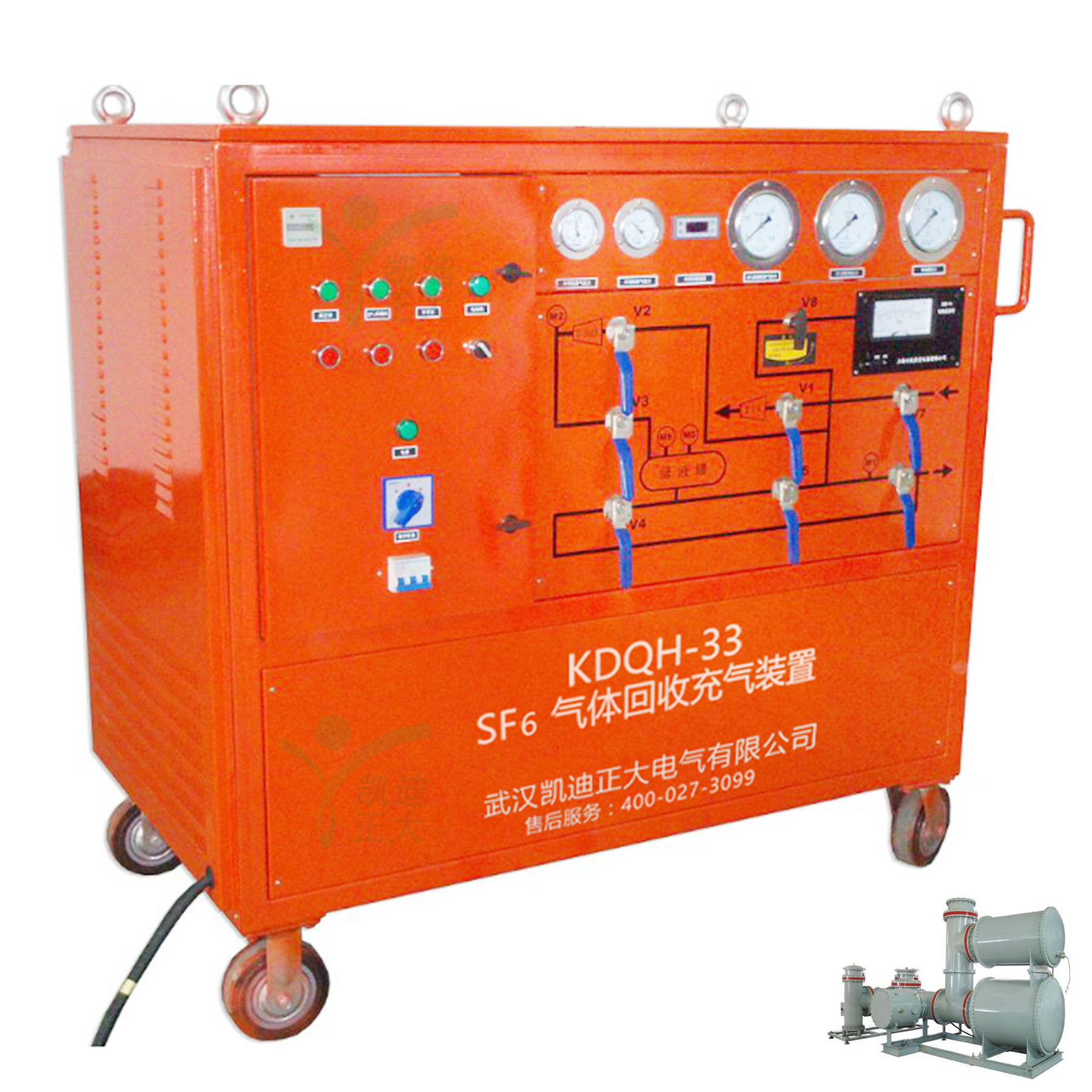 KDQC-33便攜式抽真空充氣裝置、KDQH-33六氟化硫氣體回收凈化裝置主要應用于各供電公司、送變電工程公司、發(fā)電廠、超高壓輸變電站、SF6電器開關制造廠等部門,作為GCBP、GCBT、GIS等SF6電器產品在安裝、調式、檢修時使用的輔助設備。對上述電器產品進行抽真空、回充SF6氣體操作,同時本裝置亦可用作其它部門抽真空和回充氣體的設備。