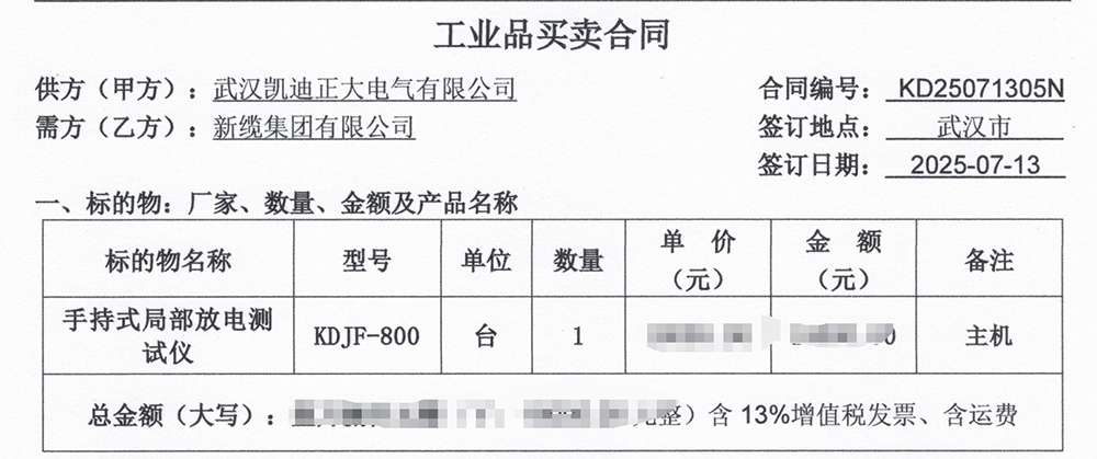 2025年7月13日,電力設備制造商新纜集團有限公司采購了武漢凱迪正大電氣有限公司的KDJF-800局部放電檢測儀,這彰顯了武漢凱迪正大在局部放電檢測領域的專業(yè)實力和市場地位。